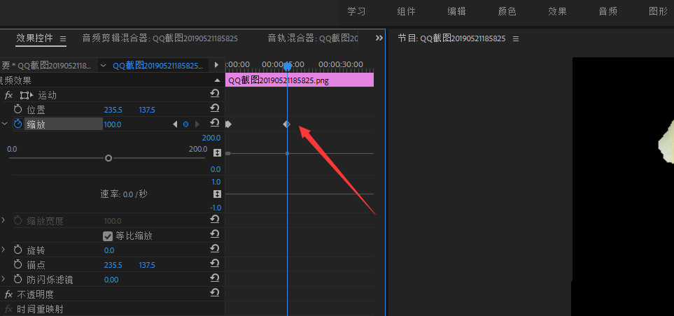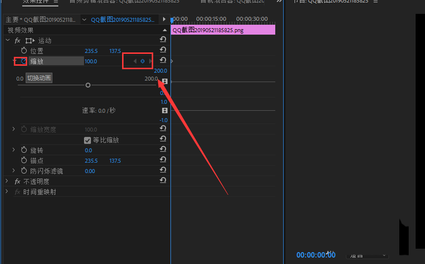 4、在效果控件中有个缩放按钮,这里是进行帧的调节