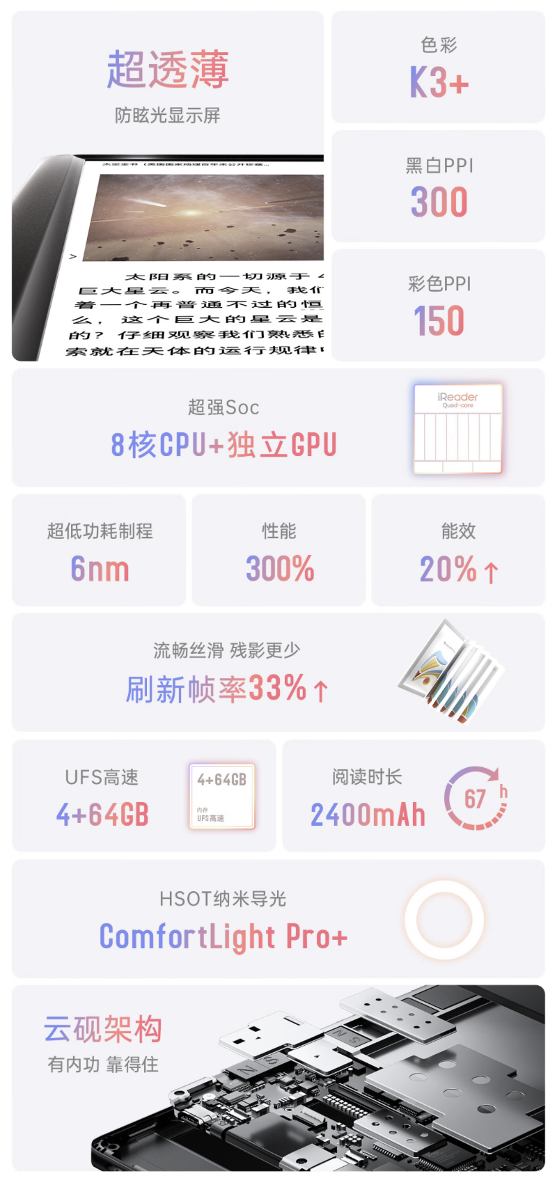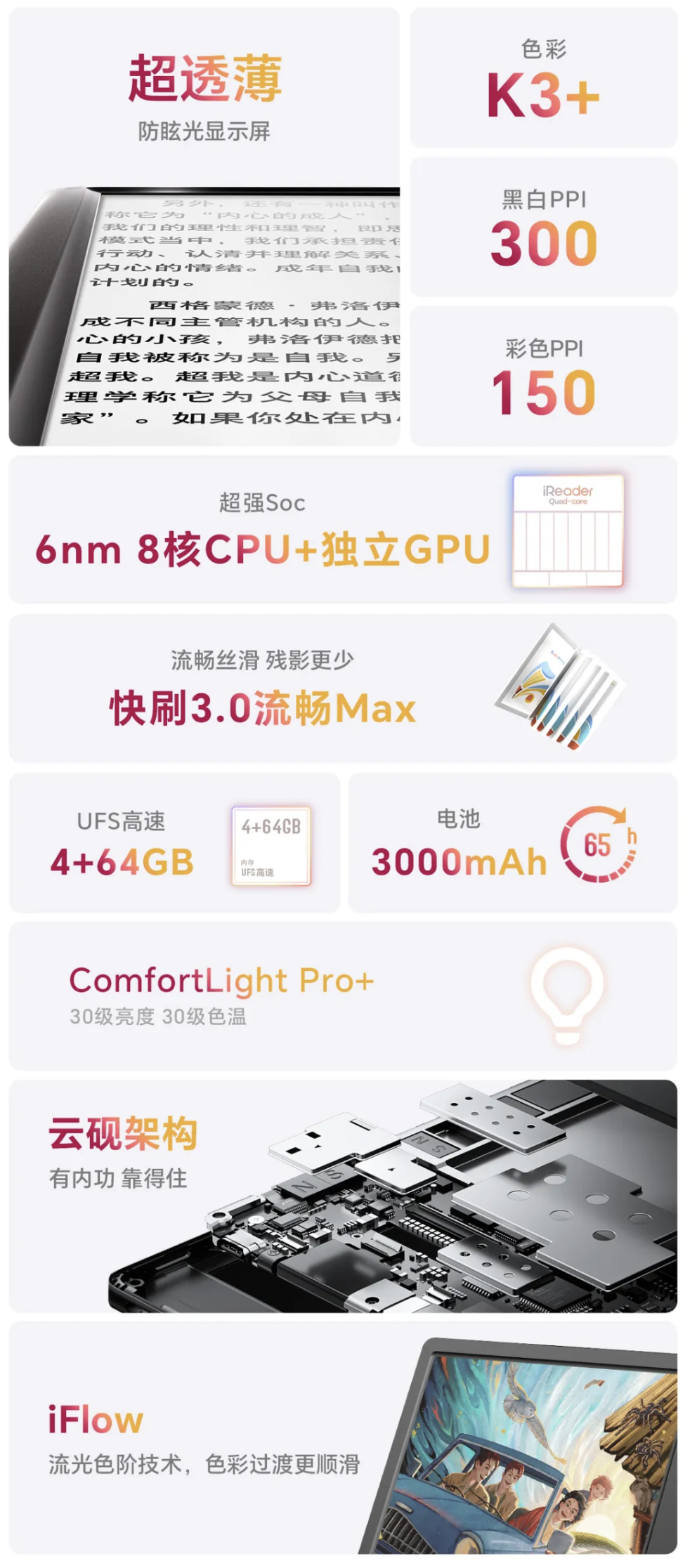 该机配备一块 7 英寸(彩色 150PPI / 黑白 300PPI)防眩光面板,支持 4096 级压感 500Hz 采样率 iReader Pencil 手写笔,提供“K3+ 色彩”,搭载 3.0 快刷技术,同时使用 ComfortLight Pro+ 背光技术,支持 30 级亮度、30 级色温。