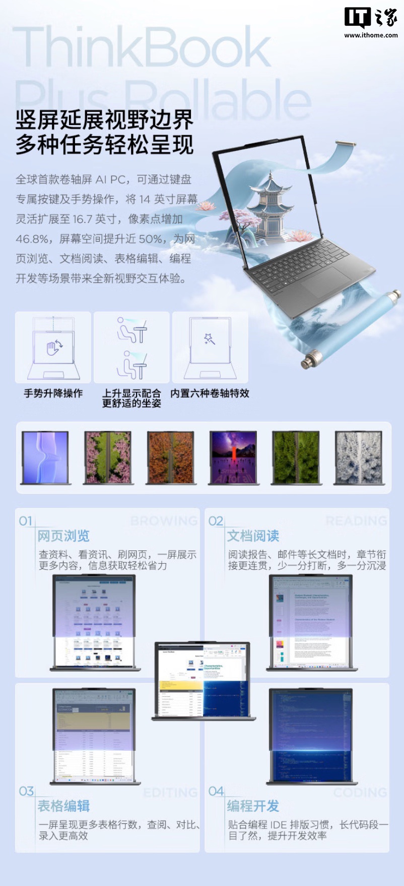 alixixi 10 月 17 日消息,联想在 CES 2025 上推出了搭载英特尔酷睿 Ultra 200V 处理器的 ThinkBook Plus Gen 6 卷轴屏电脑,可以从 14 英寸拉伸到 16.7 英寸,目前这款产品已在京东上架并开售,定价为 29999 元,成为了全球首款正式对消费者销售的卷轴屏产品。