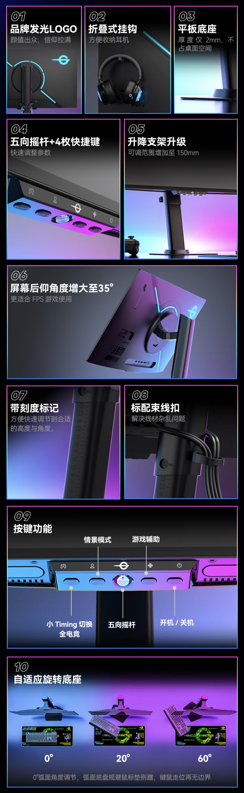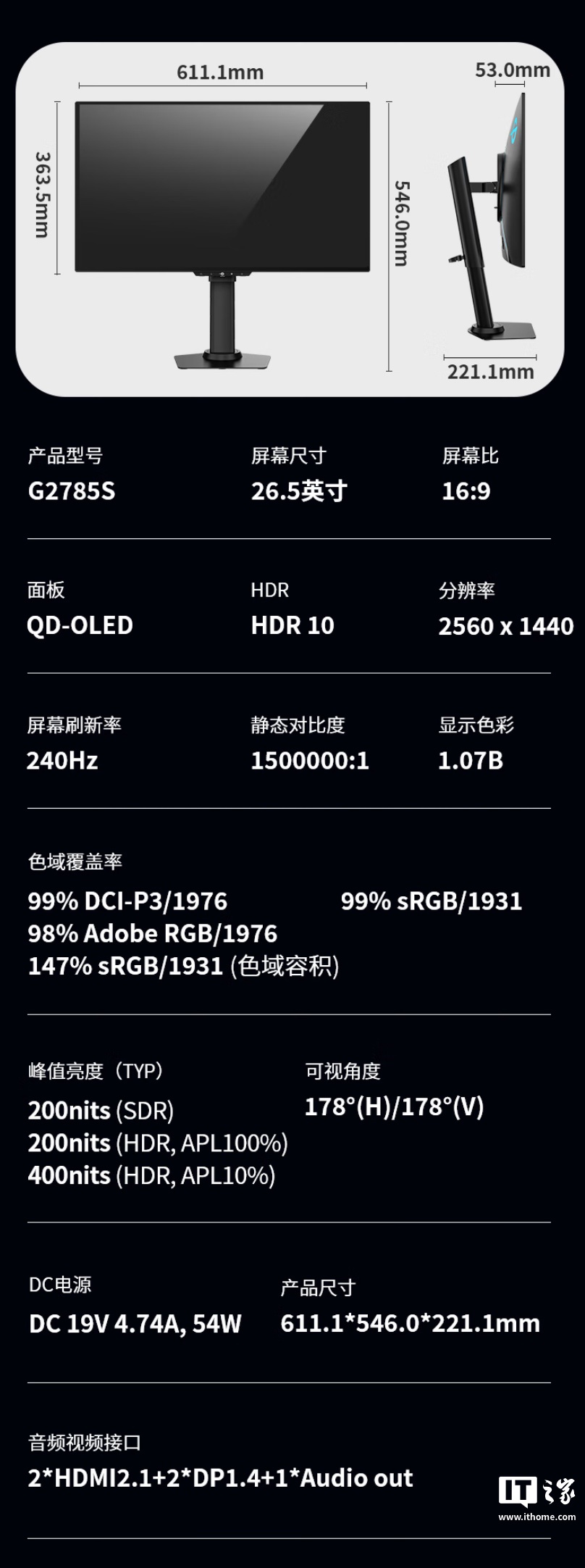 该机支架支持升降 / 倾斜 / 旋转,显示器本体支持 VESA 壁挂,提供 2 个 HDMI 2.1、2 个 DP 1.4、1 个 3.5mm 音频接口,alixixi附显示器参数如下: