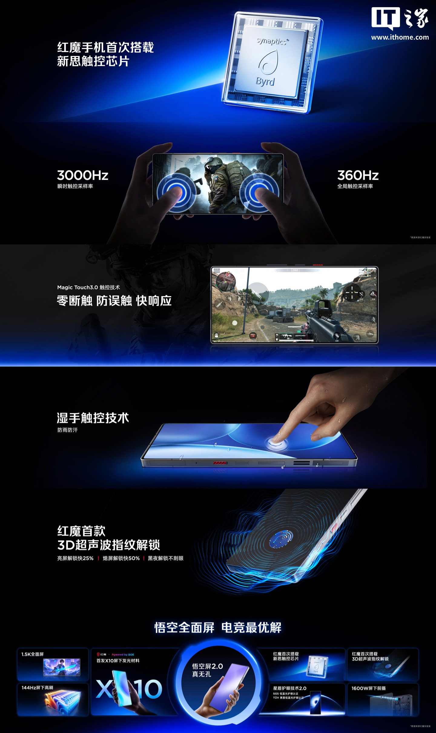 红魔 11 Pro 系列手机的 1.5K 全面屏还支持屏下 144Hz 高刷、星盾护眼技术 2.0 等。同时,系列新机是红魔首次搭载新思触控芯片和首款 3D 超声波指纹解锁机型,支持 Magic Touch 3.0 触控技术、湿手触控技术、亮屏解锁快 25%、熄屏解锁快 50%,支持黑夜解锁不刺眼特性。