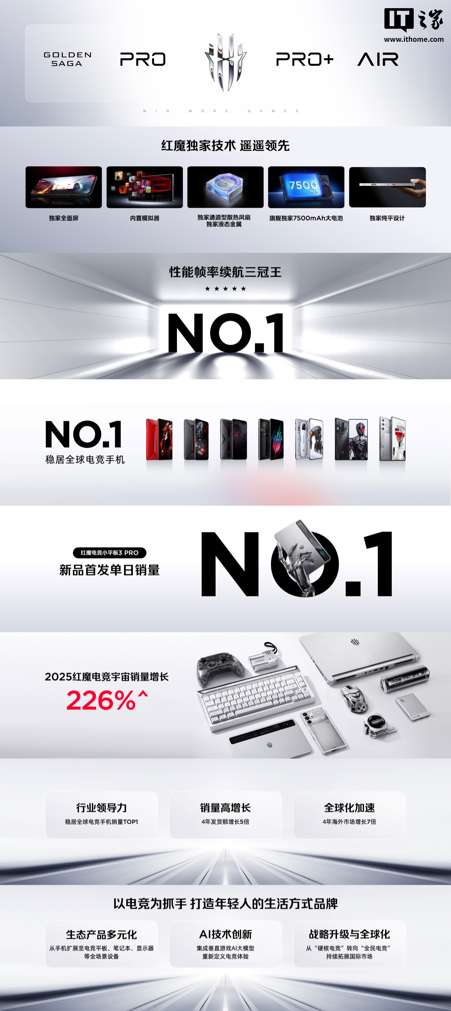 alixixi 10 月 17 日消息,红魔 11Pro 系列新品发布会正式开始,中兴通讯终端事业部总裁、努比亚技术有限公司总裁倪飞宣布:2025 红魔电竞宇宙销量增长 226%,红魔电竞平板 3 Pro 新品首发当日销量 NO.1。
