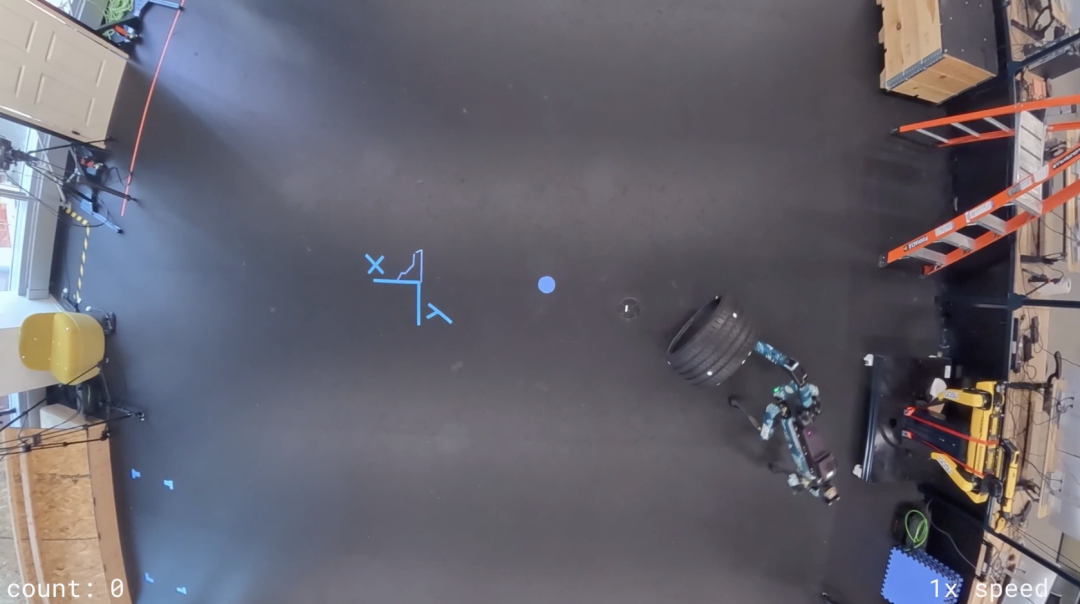 训练得到的轮胎滚动策略使机器人能够动态调整其躯干与 Spot Arm 的位置,以稳定控制滚动的轮胎,防止其倾倒,并将其引导至目标位置。