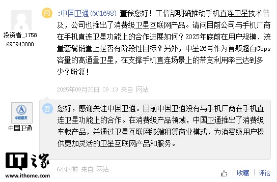 alixixi 10 月 17 日消息,中国卫通今日在投资者互动平台透露,目前中国卫通没有与手机厂商在手机直连卫星功能上的合作。在消费级产品领域,中国卫通推出了消费级车载产品,并通过卫星互联网终端租赁商业模式,为消费级用户提供更加灵活的卫星互联网产品和服务。