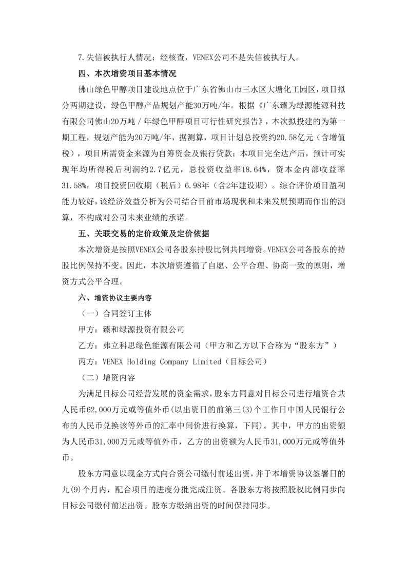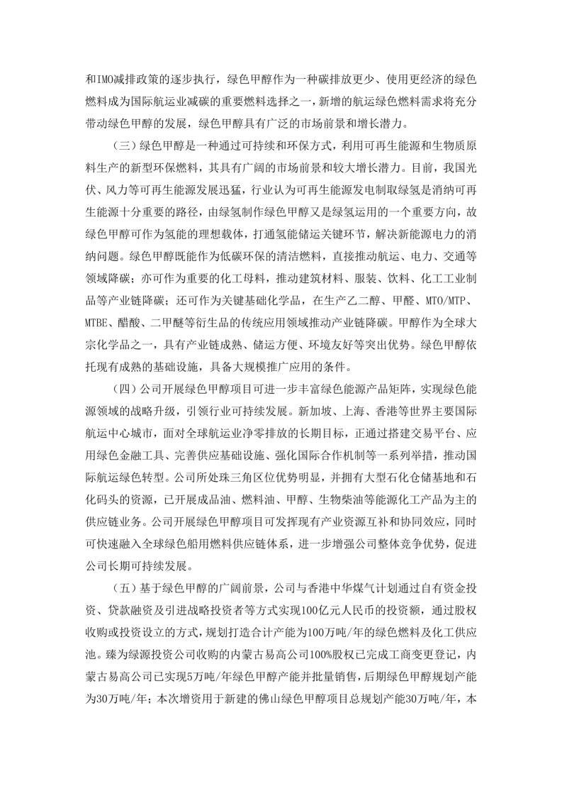 佛山绿色甲醇项目建设地点位于广东省佛山市三水区大塘化工园区,项目拟 分两期建设,绿色甲醇产品规划产能30万吨/年。根据《广东臻为绿源能源科技 有限公司佛山20万吨/年绿色甲醇项目可行性研究报告》,本次拟投建的为第一 期工程,规划产能为20万吨/年,据测算,项目计划总投资约20.58亿元(含增值 税),项目所需资金来源为自筹资金及银行贷款;本项目完全达产后,预计可实 现年均所得税后利润约2.7亿元,总投资收益率18.64%,资本金内部收益率 31.58%,项目投资回收期(税后)6.98年(含2年建设期)。综合评价项目盈利 能力较好,该经济效益分析为公司结合目前市场现状和未来发展预期而作出的测 算,不构成对公司未来业绩的承诺。