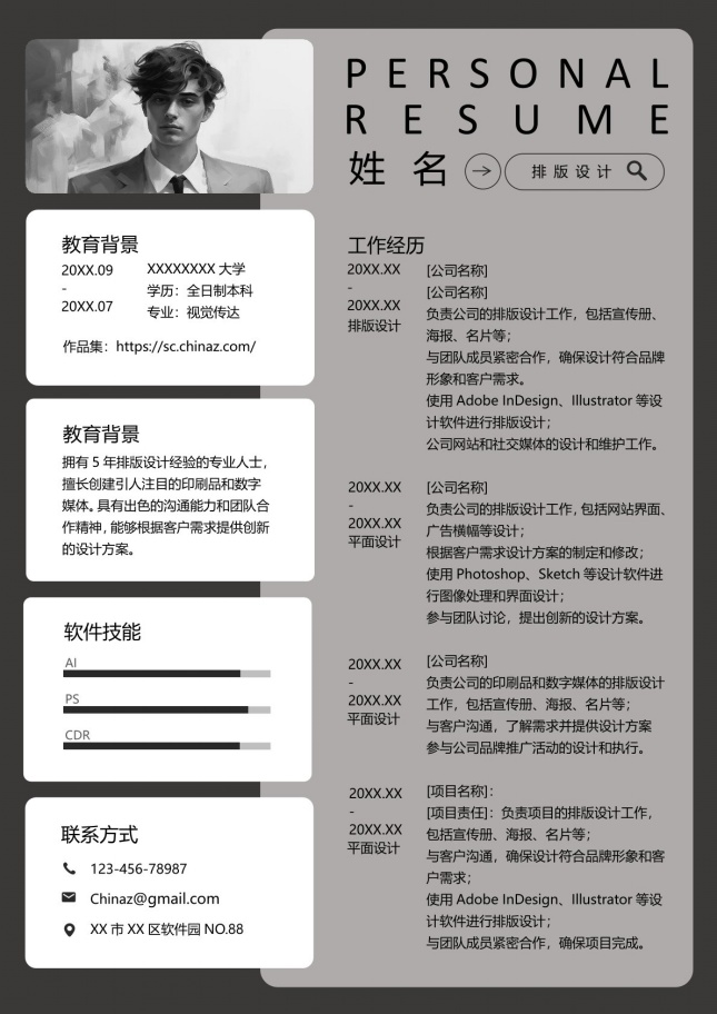 简约通用求职双栏个人简历模板,适用于通用简历、求职简历、个人简历、商务简历、找工作简历、竞聘简历等相关的个人简历主题设计应用。