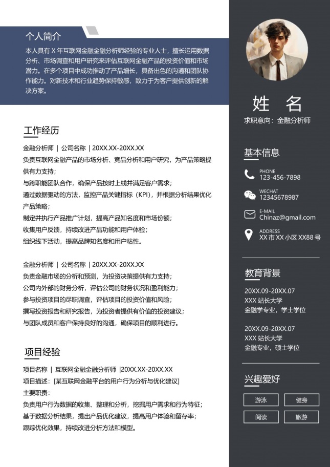 专业商务金融行业个人简历模板,适用于金融行业、通用简历、求职简历、个人简历、商务简历、找工作简历、竞聘简历等相关的个人简历主题设计应用。