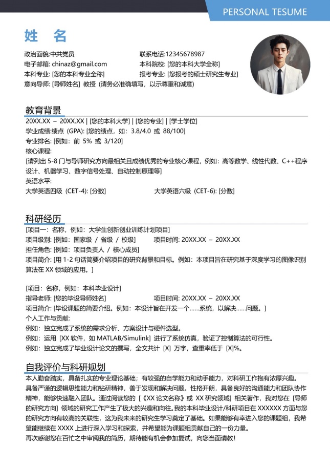 极简风考研复试个人简历模板,适用于考研复试、通用简历、求职简历、个人简历、商务简历、找工作简历、竞聘简历等相关的个人简历主题设计应用。