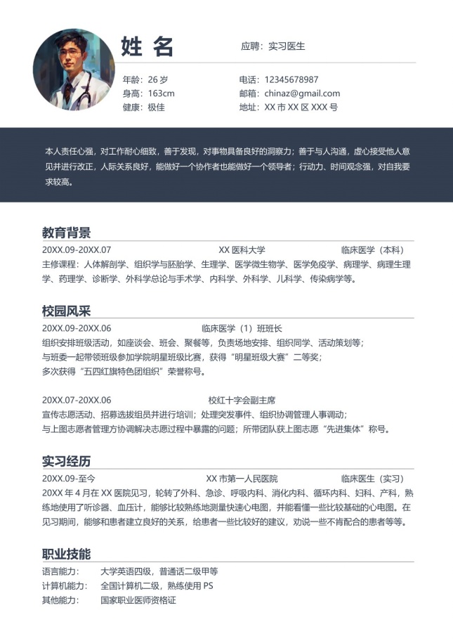 简约实习医生通用个人简历模板,适用于实习医生、通用简历、求职简历、个人简历、商务简历、找工作简历、竞聘简历等相关的个人简历主题设计应用。