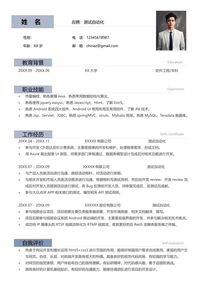 测试自动化个人简历模板,适用于测试自动化、通用简历、求职简历、个人简历、商务简历、找工作简历、竞聘简历等相关的个人简历主题设计应用。