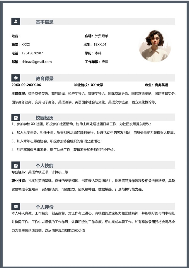 外贸跟单_粤语英语_深圳简历模板,适用于外贸跟单、通用简历、求职简历、个人简历、商务简历、找工作简历、竞聘简历等相关的个人简历主题设计应用。