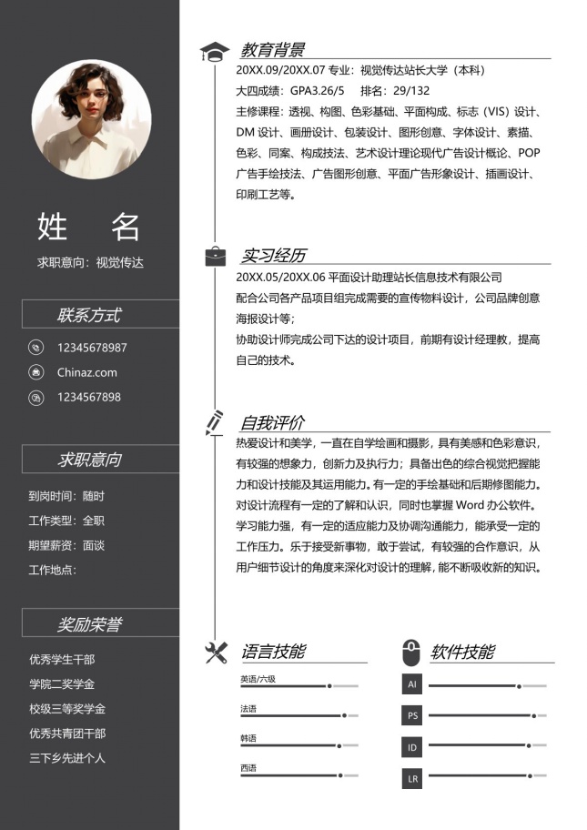 格式规范视觉设计个人简历,整体界面简洁商务风格,主体文字、图标均可替换修改,适用于通用简历、求职简历、个人简历、商务简历、找工作简历、竞聘简历等相关的个人简历主题设计应用。