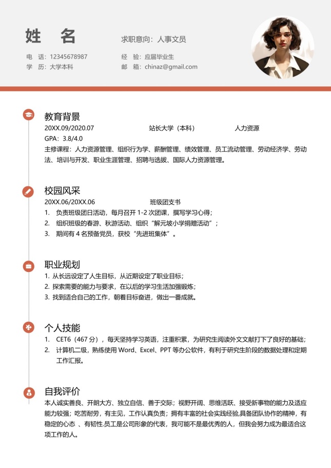 人事文员简约个人单页简历,整体界面简洁商务风格,主体文字、图标均可替换修改,适用于行政文员、人事助理、文员助理、行政助理、办公室文员、人力资源助理、人事助理、行政文秘、总经理助理、前台文员、前台接待、通用简历、求职简历、个人简历、商务简历、找工作简历、竞聘简历等相关的个人简历主题设计应用。
