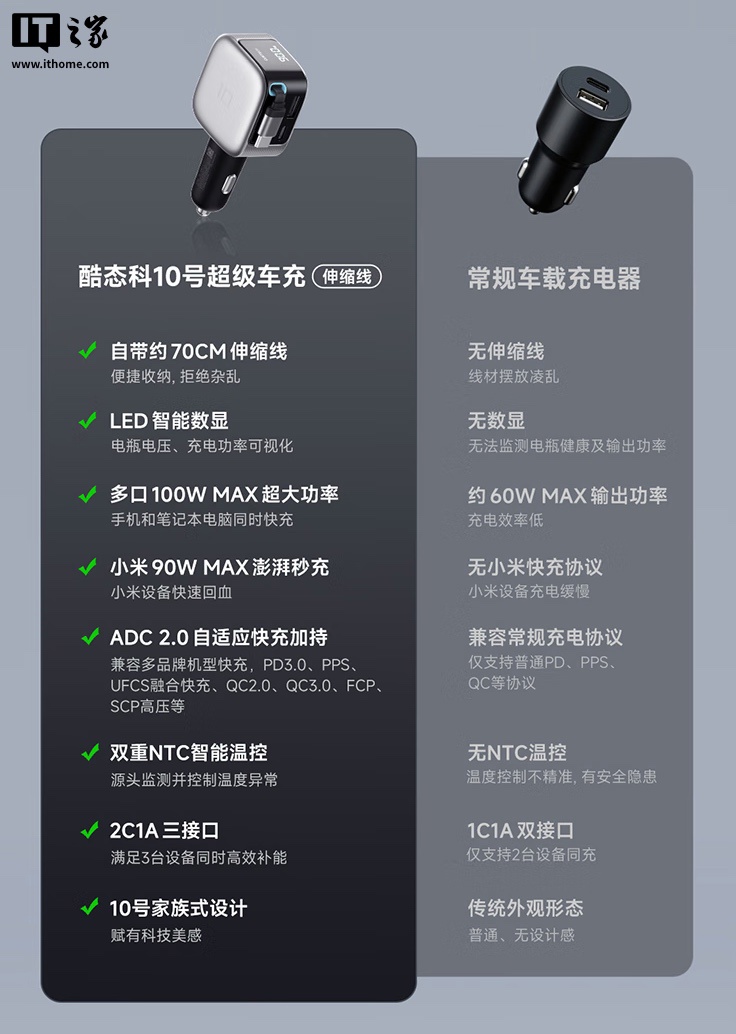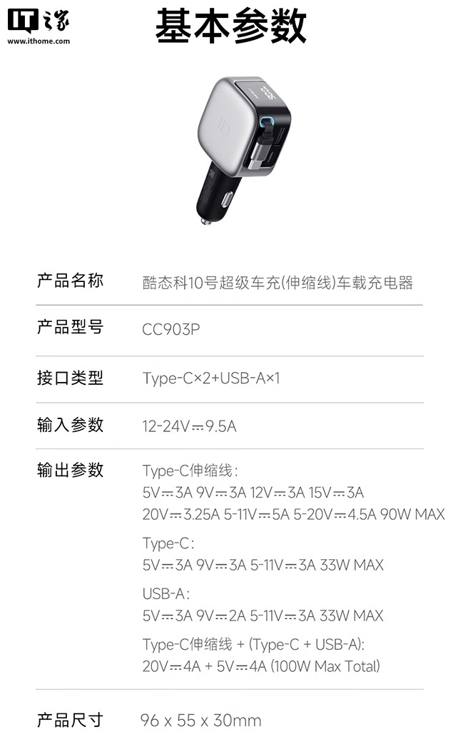 alixixi 10 月 19 日消息,酷态科 10 号超级车充「伸缩线」将于今天 10 点在京东开启首销,该产品采用 2C + 1A 设计,标准价 109 元,首发价为 99 元。
