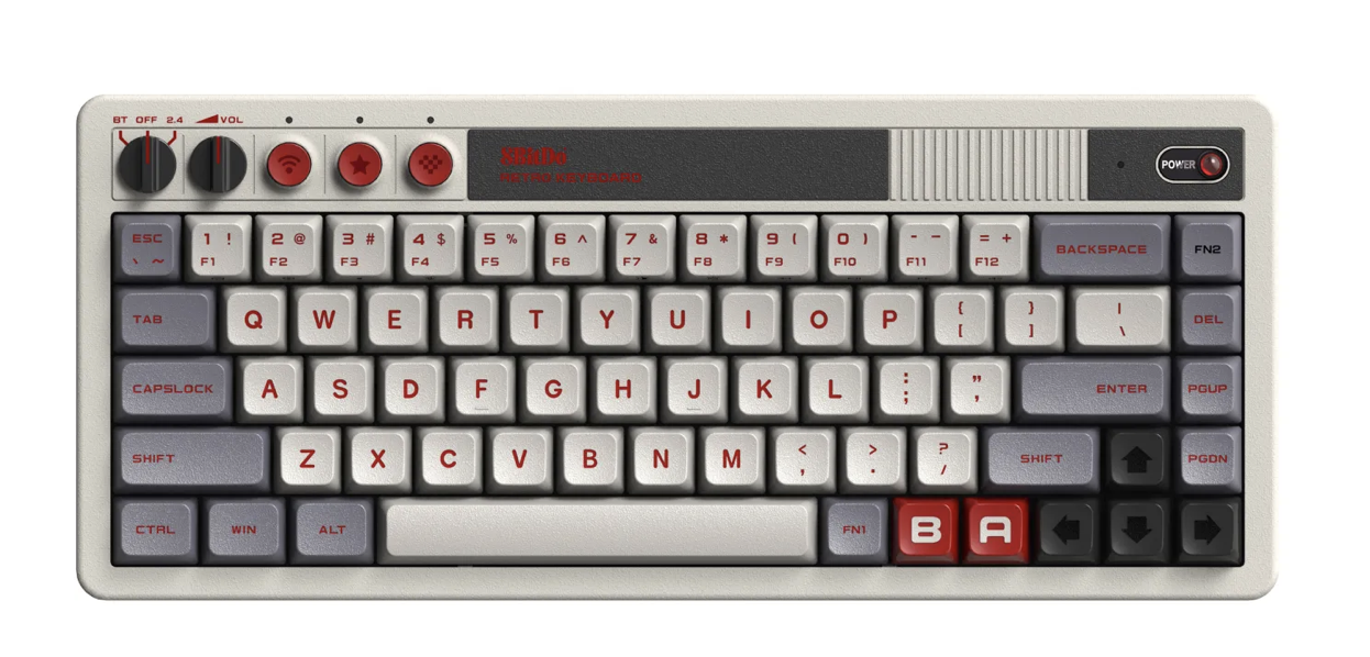alixixi 10 月 19 日消息,为纪念任天堂 NES 游戏机在北美发售 40 周年,外设品牌八位堂现已在海外市场推出了 NES40 周年纪念系列(NES40 Collection)外设套装,主要包含限定版 Ultimate 2 无线手柄、Retro 68 机械键盘及 Retro Cube 2 蓝牙音箱。
