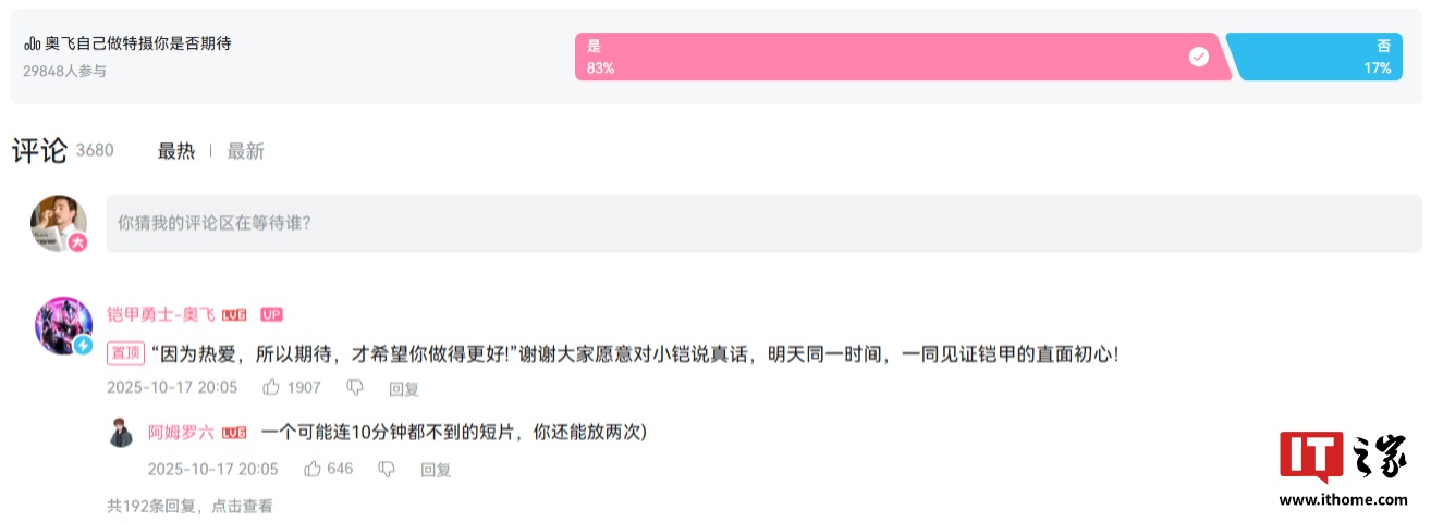 根据官方描述,《铠甲勇士・新生》是奥飞一次充满诚意的尝试,也是面向未来的新生。值得一提的是,奥飞在《铠甲勇士・新生》短片的 P1 部分放置了投票,询问用户“奥飞自己做特摄你是否期待”,29848 人参与了该投票,83% 的用户选择“是”。这暗示奥飞或将重启自己做特摄的企划。