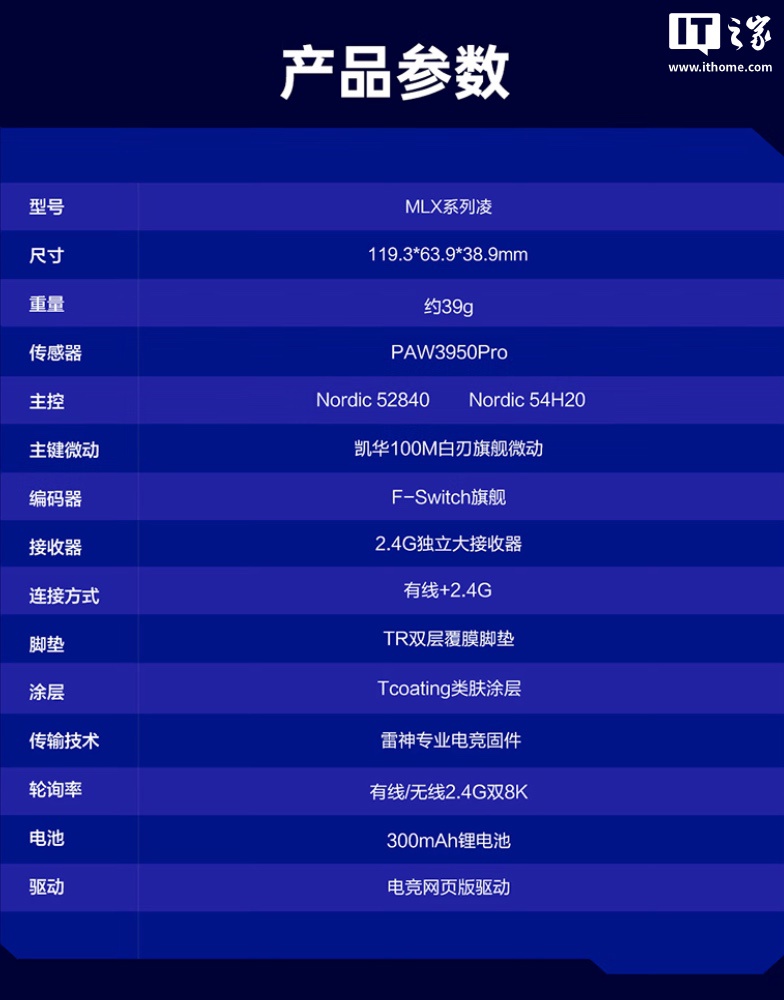 alixixi 10 月 20 日消息,雷神现已在京东上架一款 MLX 凌超轻量化游戏鼠标,该鼠标主打 39g 设计、匹配原相 PAW3950 Pro 芯片及 Nordic 52840 主控,定价为 329 元,首发价 299 元。