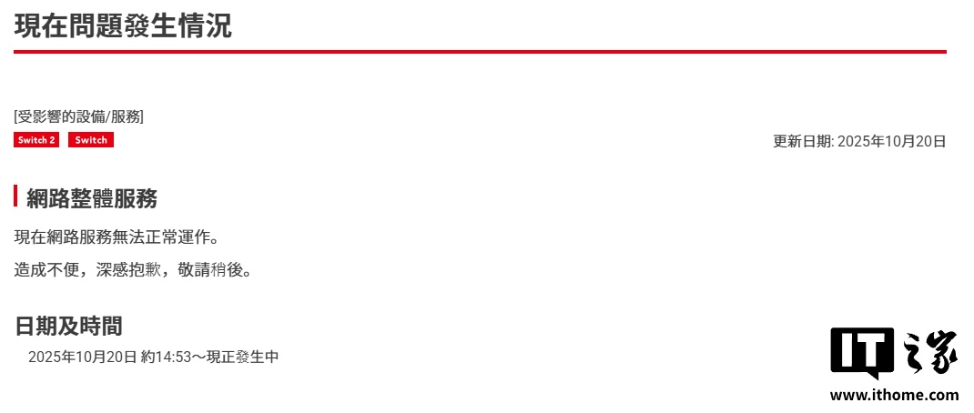 alixixi 10 月 20 日消息,任天堂今日在中国香港、日本等官网发布公告:“网络服务当前未正常运行,对于由此造成的任何不便,我们深表歉意,请稍等一段时间才能恢复。”