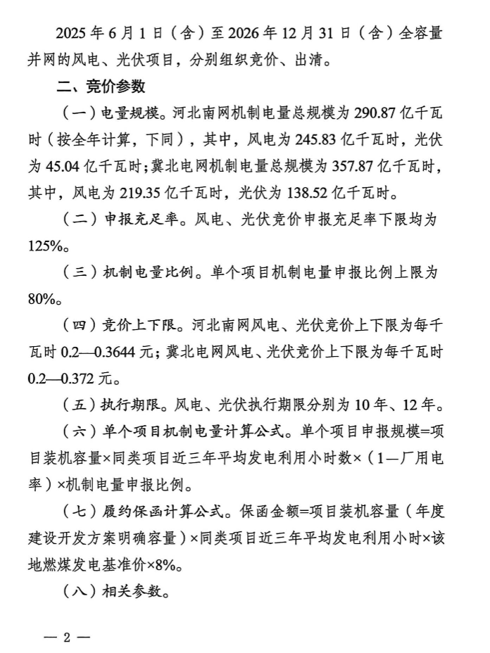 (四)竞价上下限。河北南网风电、光伏竞价上下限为每千瓦时0.2-0.3644元;冀北电网风电、光伏竞价上下限为每千瓦时0.2-0.372元。