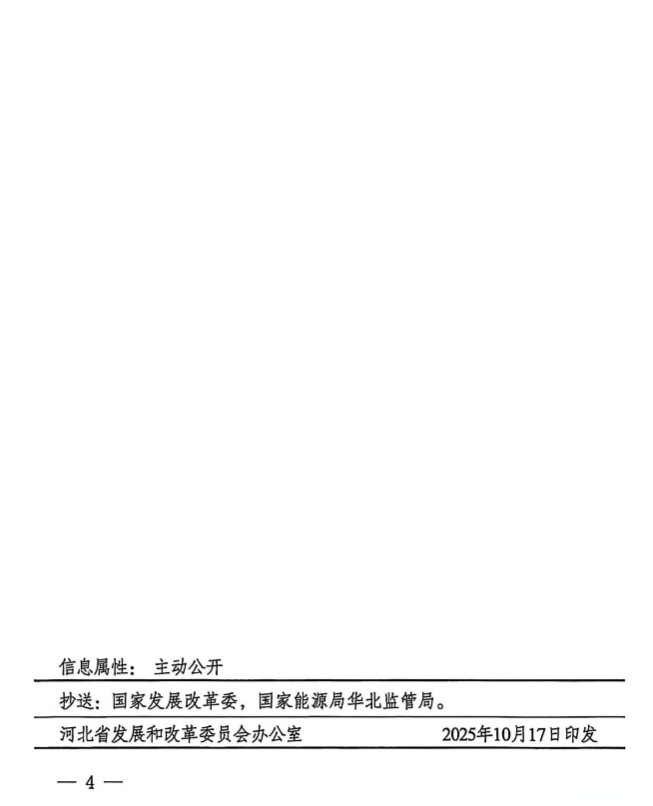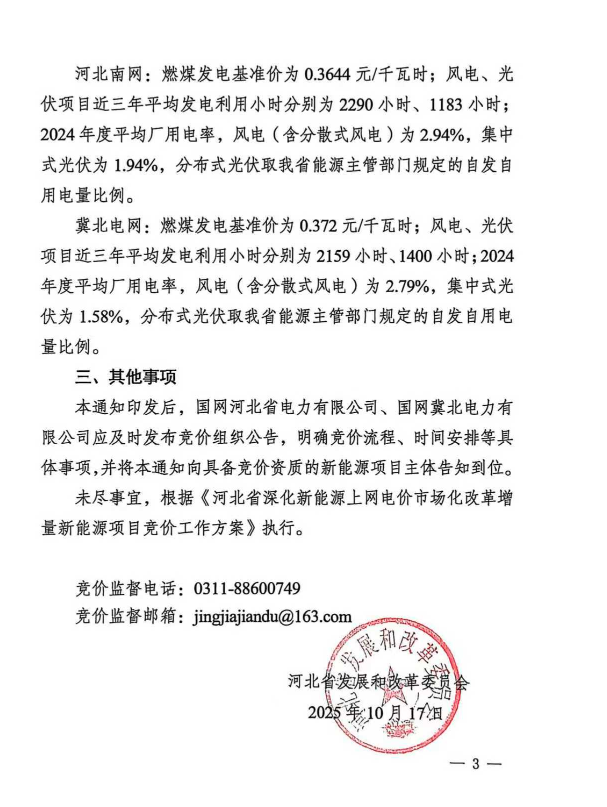 10月20日,河北省发展和改革委员会发布关于2025-2026年度新能源机制电价竞价工作有关事项的通知,通知指出,2025年6月1日(含)至2026年12月31日(含)全容量并网的风电、光伏项目,分别组织竞价、出清。