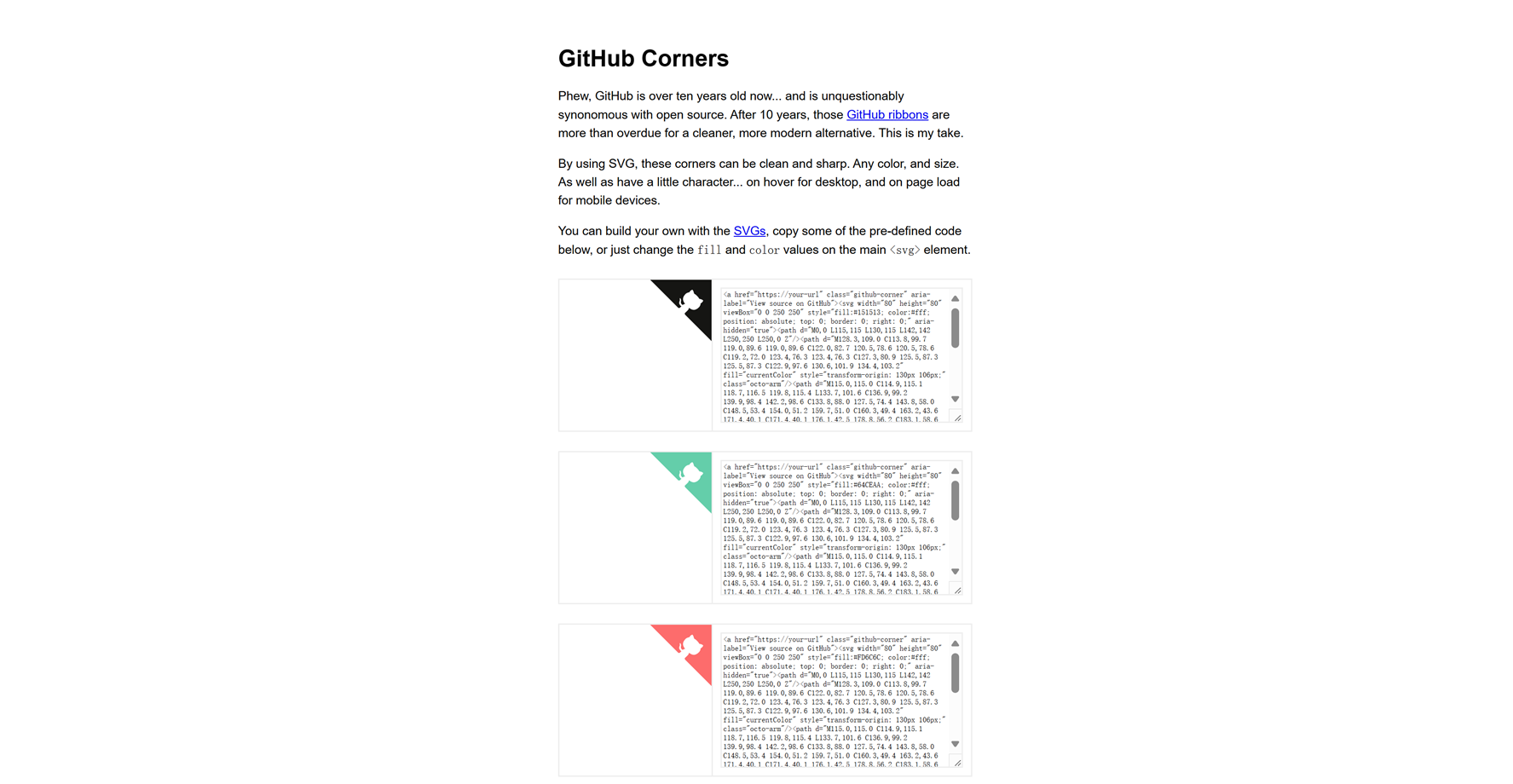 可以在页面的四角显示Github角标,可以自定义大小、背景颜色。当鼠标移动到这个角标时还能看到Github摇尾巴的动画