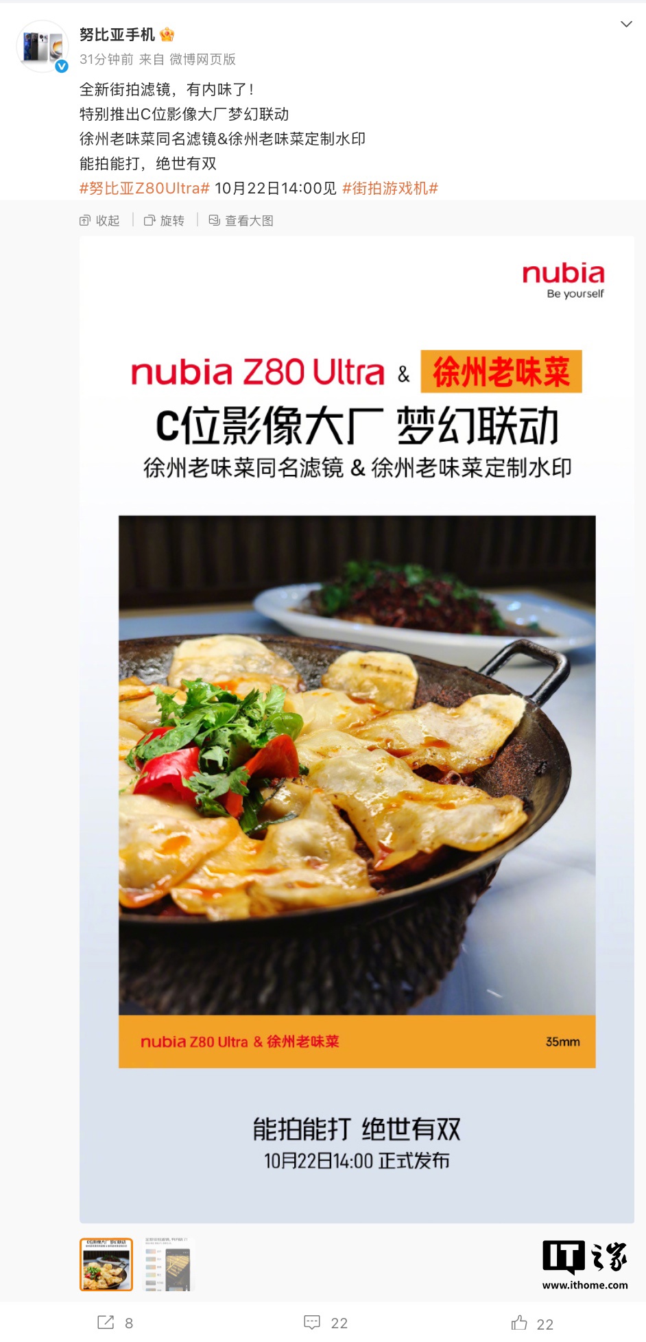 alixixi 10 月 21 日消息,努比亚手机发文,透露努比亚 Z80 Ultra 手机将提供“徐州老味菜同名滤镜 / 徐州老味菜定制水印”,该机将于 10 月 22 日 14:00 发布。
