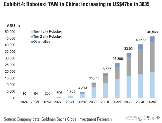 据高盛预测,到2035年,中国Robotaxi市场将由一线和二线城市主导。其中,一线城市(北上广深等)预计贡献42%的市场份额,规模将达近195亿美元;二线城市市场占比更高,达50%,对应约231亿美元。