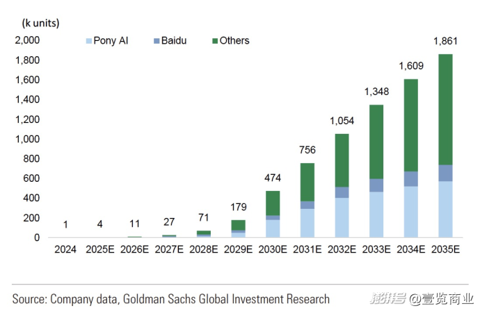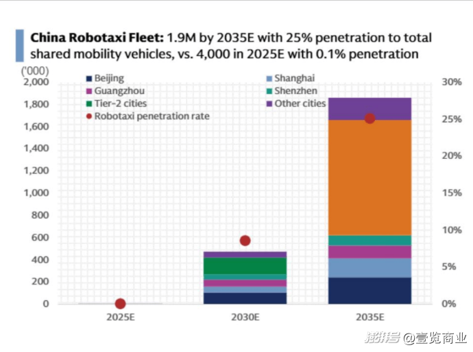 从车辆规模看,中国的Robotaxi将由2025年的4100辆增至2035年的190万辆。其中,包括小马智行、文远知行、百度Apollo等厂商在内的现任参与者将成为其中主要玩家。