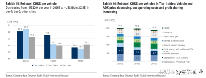 研报中还提到,成本端也将因为规模化生产、技术成熟和供应链优化而降低。2025到2035年间,一线城市Robotaxi的单车制造成本预计将从2.01万美元逐步下降到1.89万美元。