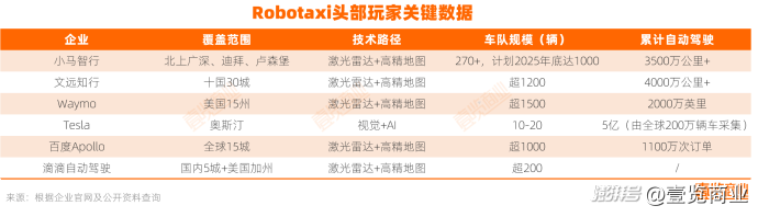 在这样的技术和资本壁垒下,被视为Robotaxi行业有竞争力的玩家并不多,主要有: