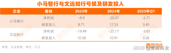 比如小马智行,2023年全年的研发投入就达到8.71亿元,2024年进一步增长到17.53亿元,2025年第一季度也保持了3.45亿元的投入水平。但与此同时,净利润却在持续恶化:2023年亏损8.9亿元,2024年亏损超过20亿元,2025年一季度也还有接近3亿元的亏损。