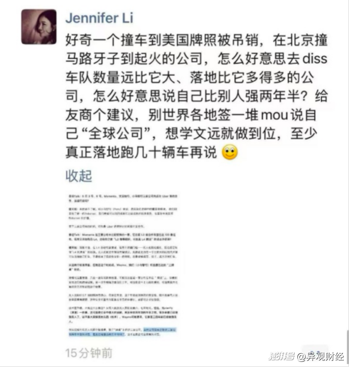 此言论一出,文远知行CFO李璇在微信朋友圈公开回击楼天城,列举小马智行美国牌照被吊销,以及小马智行在无人驾驶测试车在北京亦庄运行时偏离轨迹,撞上绿化带后起火等问题。