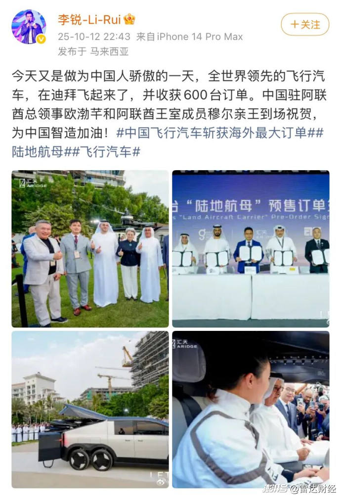10月12日,李锐在微博平台激动发文,分享了一个令他心潮澎湃的时刻,“今天又是作为中国人骄傲的一天,全世界领先的飞行汽车,在迪拜飞起来了,并收获600台订单”。