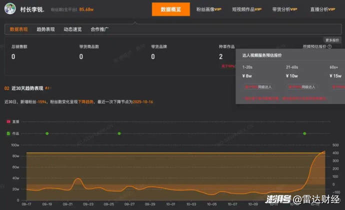 另据第三方平台数据,“村长李锐.”视频平台账号1-20秒视频预估报价为8万,21-60秒视频预估报价为10万,超60秒视频预估报价为15万。