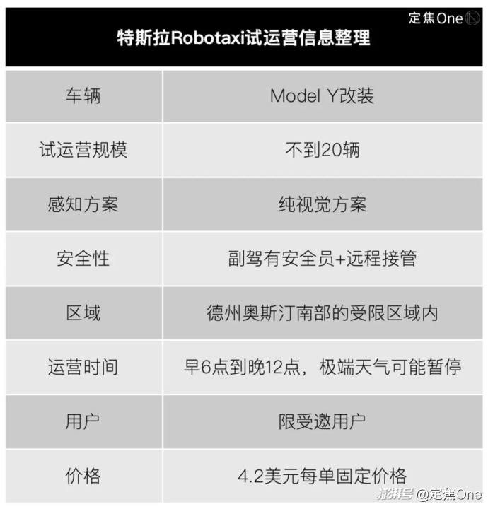 特斯拉现阶段仅有10-20辆Model Y(市场期待的Cybercab并未现身)提供服务,车辆搭载特斯拉视觉感知系统和FSD(全自动驾驶软件);服务范围限制在奥斯汀南部区域(只有谷歌Waymo的一半);乘客采取邀请制,主要面向特斯拉员工、投资者及科技博主;单次行程固定收费4.2美元,行程时长仅3到5分钟;更关键的是,副驾驶座始终配备一名安全员。