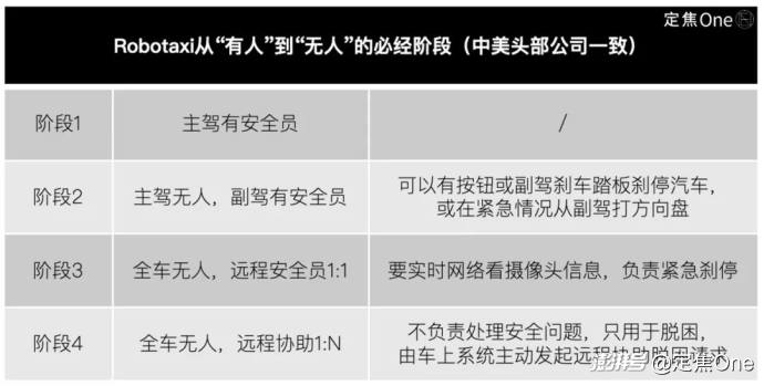 按照Robotaxi从“有人”到“无人”的四个发展阶段来看,特斯拉“副驾安全员+20辆车”的配置,只在小范围区域做到了第2阶段,仅相当于Waymo七八年前在凤凰城的早期测试(Early Rider)阶段;而中国Robotaxi头部公司2021年已在北京、广州进入“主驾无人”的测试阶段,如今,百度、小马智行已在多个城市区域实现最后一个阶段的商业化与规模化运营。
