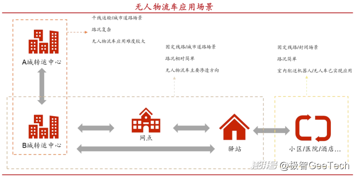 无人物流配送车目前大规模落地场景为快递末端配送中的“网点到驿站”段。