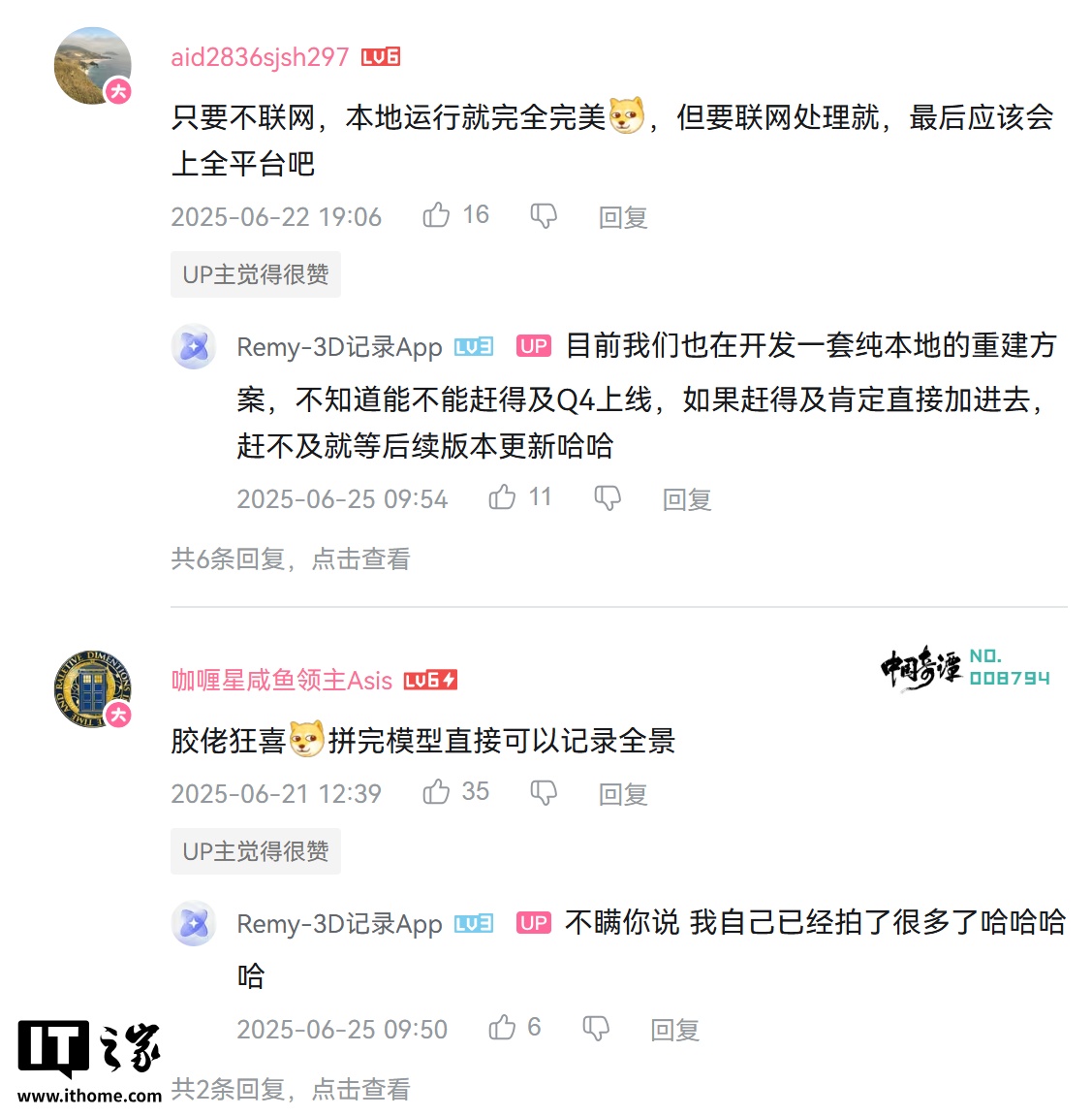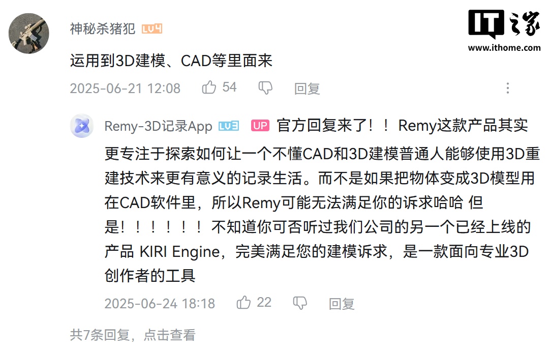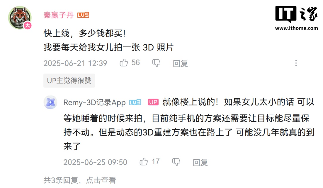 alixixi从“Remy”的B站视频评论获悉,这款产品更专注于探索如何让不懂 CAD 和 3D 建模的普通人能使用 3D 重建技术来更有意义地记录生活,而不是如何把物体变成 3D 模型用在 CAD 软件里。目前该应用的纯手机方案需要让目标能尽量保持不动,动态 3D 重建方案也在路上,可能没几年到来。