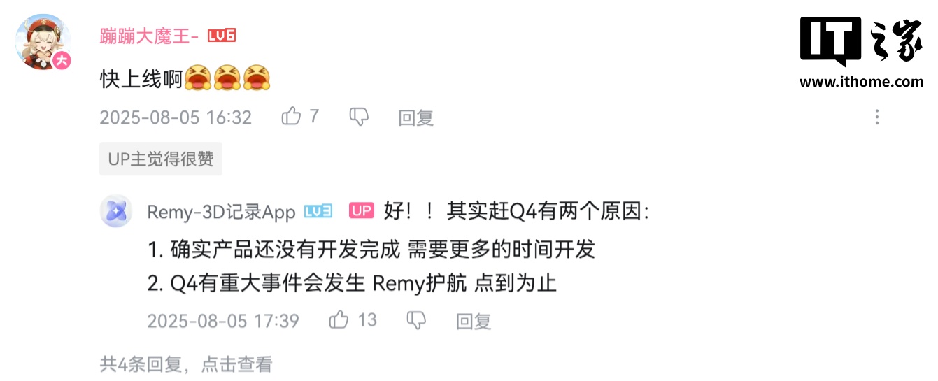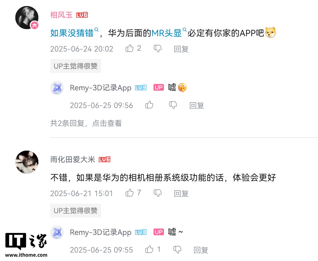 此外,针对用户猜测华为推出 MR 头显将有 Remy 应用、以及表示“如果是华为的相机相册系统级功能的话,体验会更好”的评论,Remy 回复了一个字“嘘”,暗指更多合作内容将保密。
