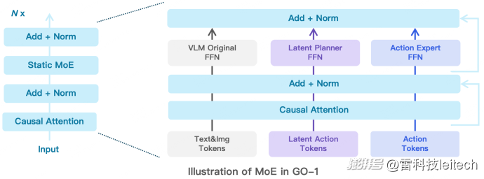 MoE则分为隐式规划器和动作专家两部分,隐式规划器可利用互联网上的人类或跨本体视频,基于VLM的中间层输出潜在动作令牌(Latent Action Tokens),形成规划链(Chain of Planning),实现通用的动作理解和规划。动作专家可借助仿真或真机数据,优化潜在动作令牌的生成和输出效率,并获得高精度动作的执行能力。