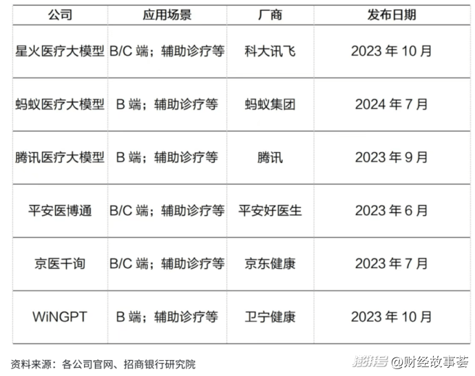 腾讯于2023年9月上线“腾讯医疗大模型” ,发力智能导诊、电子病历等;京东健康依托其在医药供应链和互联网医疗领域的既有优势,于2023年7月发布了模型“京医千询”,补全其服务生态的AI能力 ;平安好医生作为保险巨头平安集团旗下的医疗健康平台,推出平安医博通,探索“医疗+保险”的协同模式;科大讯飞发布“星火医疗大模型”等,旗下“智医助理”率先通过了国家执业医师资格测试……