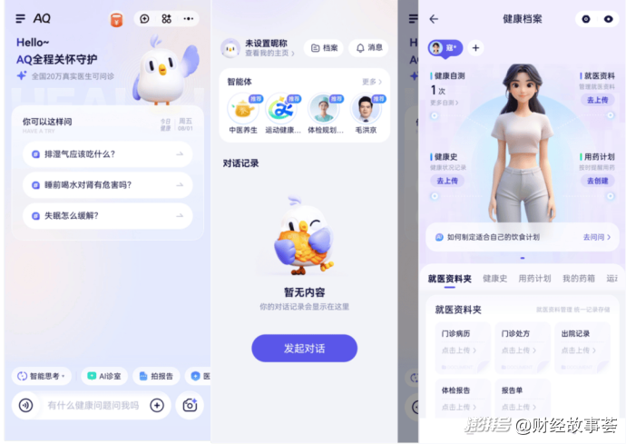 尤其是金融和健康医疗的协调,参考平安好医生曾推动的“医疗+保险”打包增值路径,未来AQ所沉淀的用户健康档案、慢性病行为数据,或许能反哺到保险产品的定价和风控,形成“健康管理+风险保障”的闭环协同——眼下答案尚不明确,但模式不难想象。