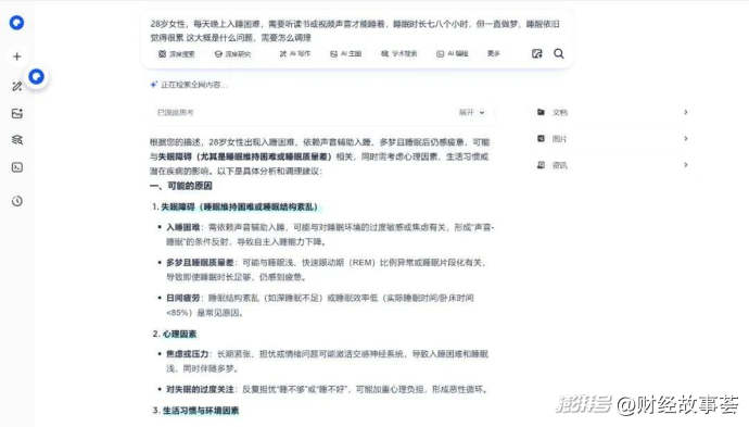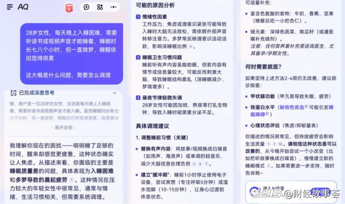正式进入AI健康咨询阶段。当我输入我的问题后,AQ启动深度思考模式,快速生成了一份结合医学文献的初步报告。内容涵盖了可能的病因分析、生活方式建议和调理方案,并且严谨地在每条建议后附上了文献出处。
