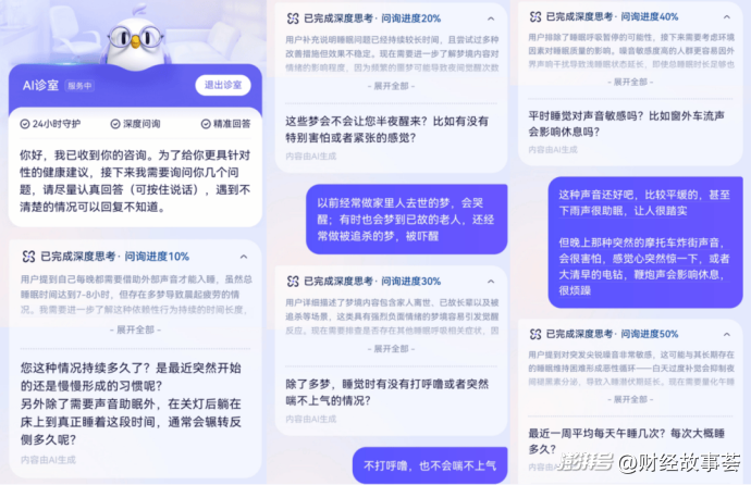这正是许多医疗大模型产品面临的体验瓶颈:能够“泛泛而答”,却难以“深入追问”。针对这一瓶颈,蚂蚁AQ设计了“AI诊室”功能,通过多轮追问来模拟真实医生的问诊过程。