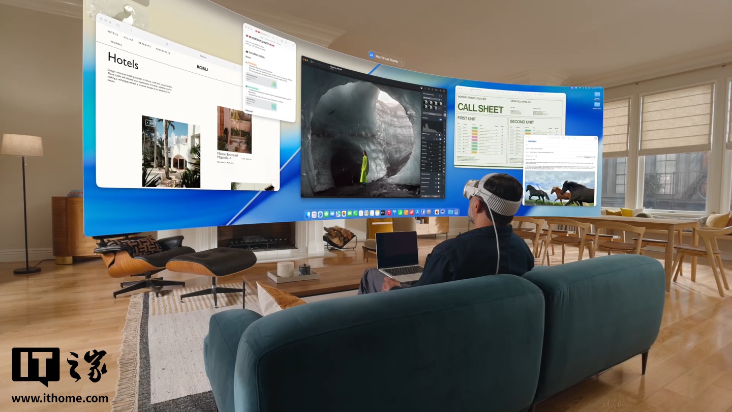 与专用 R1 芯片协同工作时,系统可在 12 毫秒内处理来自 12 个摄像头、5 个传感器和 6 个麦克风的数据并实时显示;电池续航提升至最长 2.5 小时(一般使用)~3 小时(视频播放),并支持持续供电以延长使用时间。
