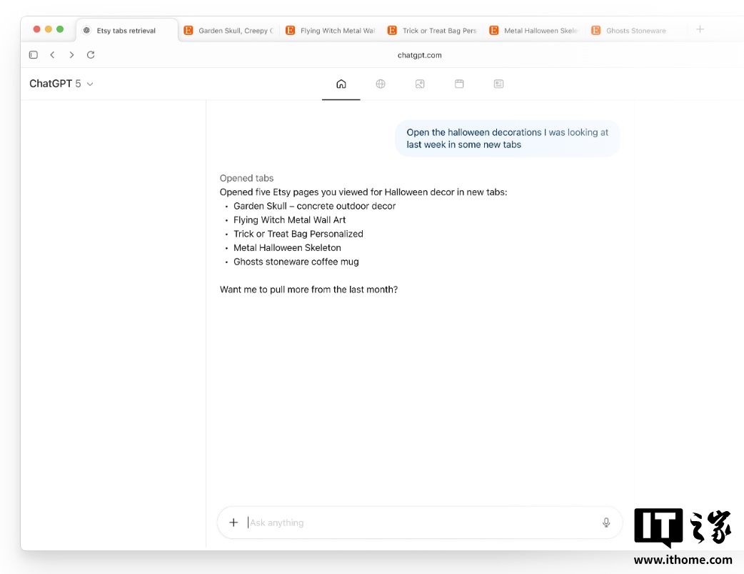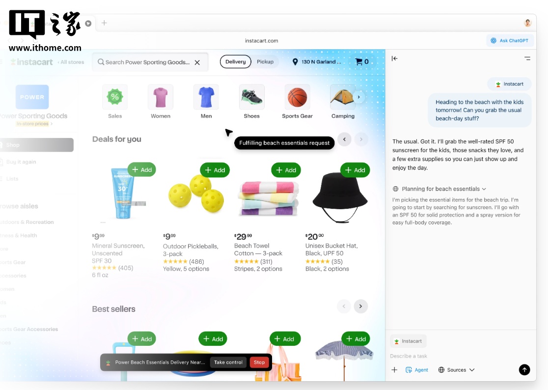 在智能体模式下,ChatGPT 会自动与网站互动,并始终在用户的控制之下,比如为旅行进行研究和购物。该功能目前仅对 Plus、Pro 和 Business 账户提供预览。