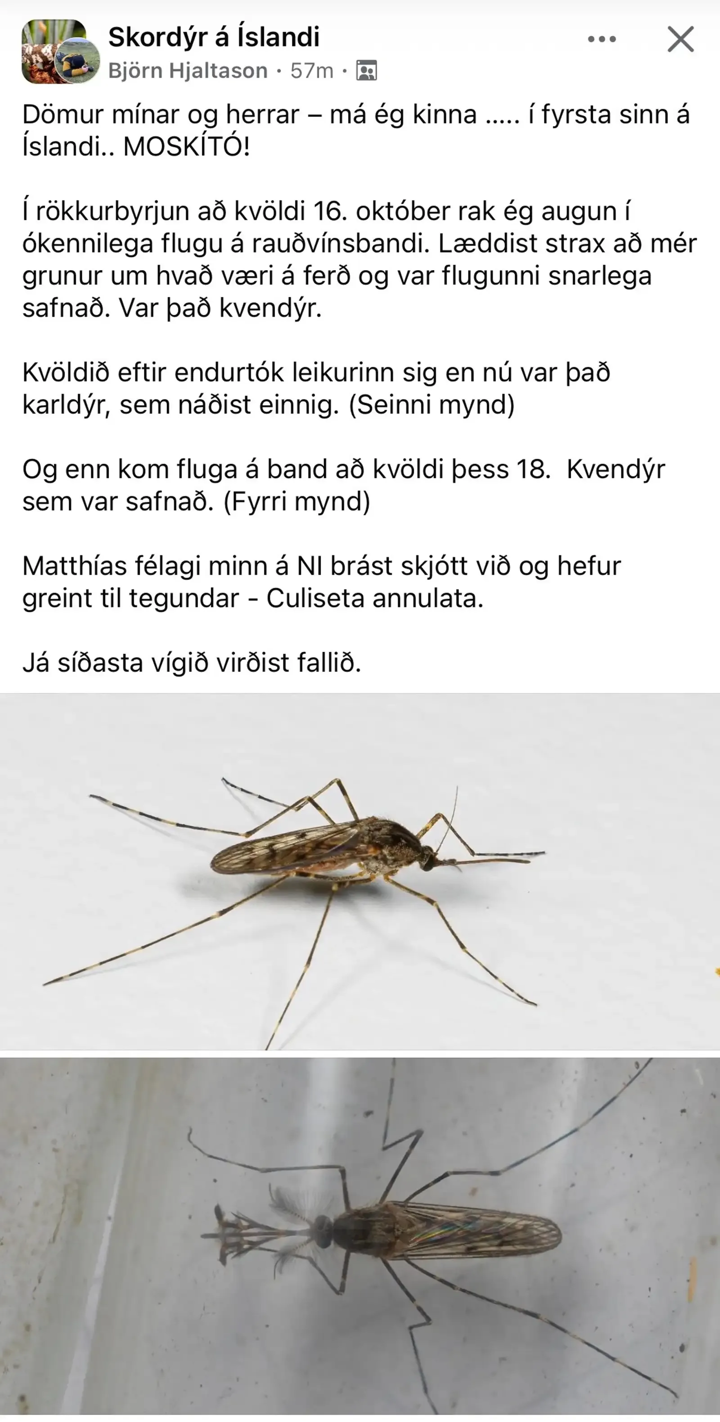 帖子一经发出便迅速引起关注,随后由冰岛自然历史研究所(Icelandic Institute of Natural History)的昆虫学家 Matthías Alfreðsson 确认,这些蚊虫属于 Culiseta annulata 种,这是该物种及蚊虫在冰岛本土的首次被证实记录。
