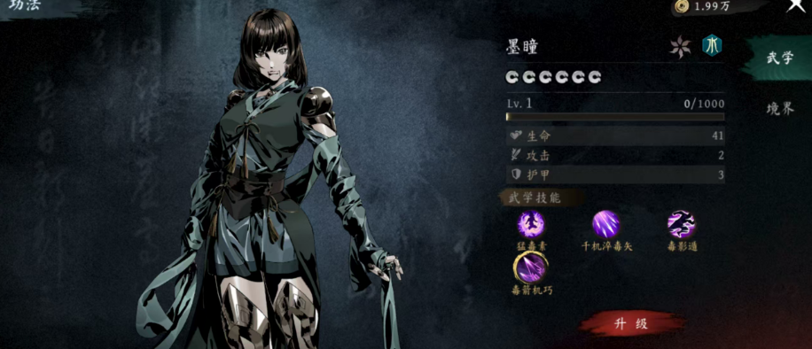 第三个为大家推荐的就是墨瞳,这个目前来说是一个比较适合玩毒流派的英雄,她在游戏当中带的毒素效果,爆发能力还是不错的,而且后期的增益效果上面,是可以将毒素爆发的能力带来50%的伤害提升效果,后期技能上面有一个千机淬毒石,这个技能带来输出的时候一次性就可以带来9枚毒箭的远程攻击,但是要消耗的内力数值比较高,消耗了30点内力数值之后,这里造成攻击的同时,还可以带来40%的水属性伤害,这个属性伤害当中同样也带有一定的中毒效果。所以给敌人带来的负面影响还是非常多的,但是她作为一个水属性的角色,后期的技能上面大部分都是一些水属性的范围伤害。