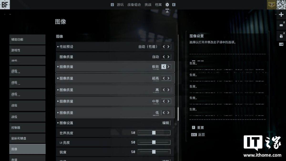 图像质量除自动档外,可设置为极致、超高、高、中等,以及低 5 个预设档位,进阶玩家则可对每个选项单独调节,也就是自定义设置。