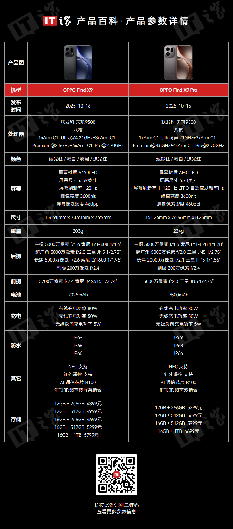 其他方面,Find X9 内置 7025mAh 冰川电池(OPPO 自研第四代硅碳负极材料),支持 80W 快充,50W 无线充电、5W 无线反向充电;配备 OPPO 晶盾玻璃后盖,支持 Wi-Fi 7、NFC、红外遥控、超声波指纹识别,支持 IP66 & IP68 & IP69 防尘防水,配备超线性双扬声器、四麦克风、三重 Wi-Fi 天线系统、X 轴线性马达,搭载 ColorOS 16 系统。